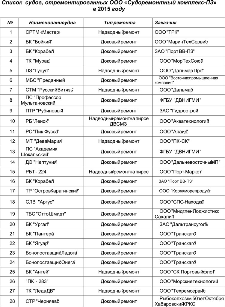 Как следует из отчета «Судоремонтного комплекса-ПЗ», в 2015 году был произведен ремонт на 50 судах, из них отдоковано в полном объеме 31 судно (в 2014 году - 27 судов). Основная доля заказов приходилась на комплексные ремонты, однако выполнен значительный перечень работ по ремонту отдельных механизмов и систем, дизелей, трубопроводов, коленчатых валов и пр.