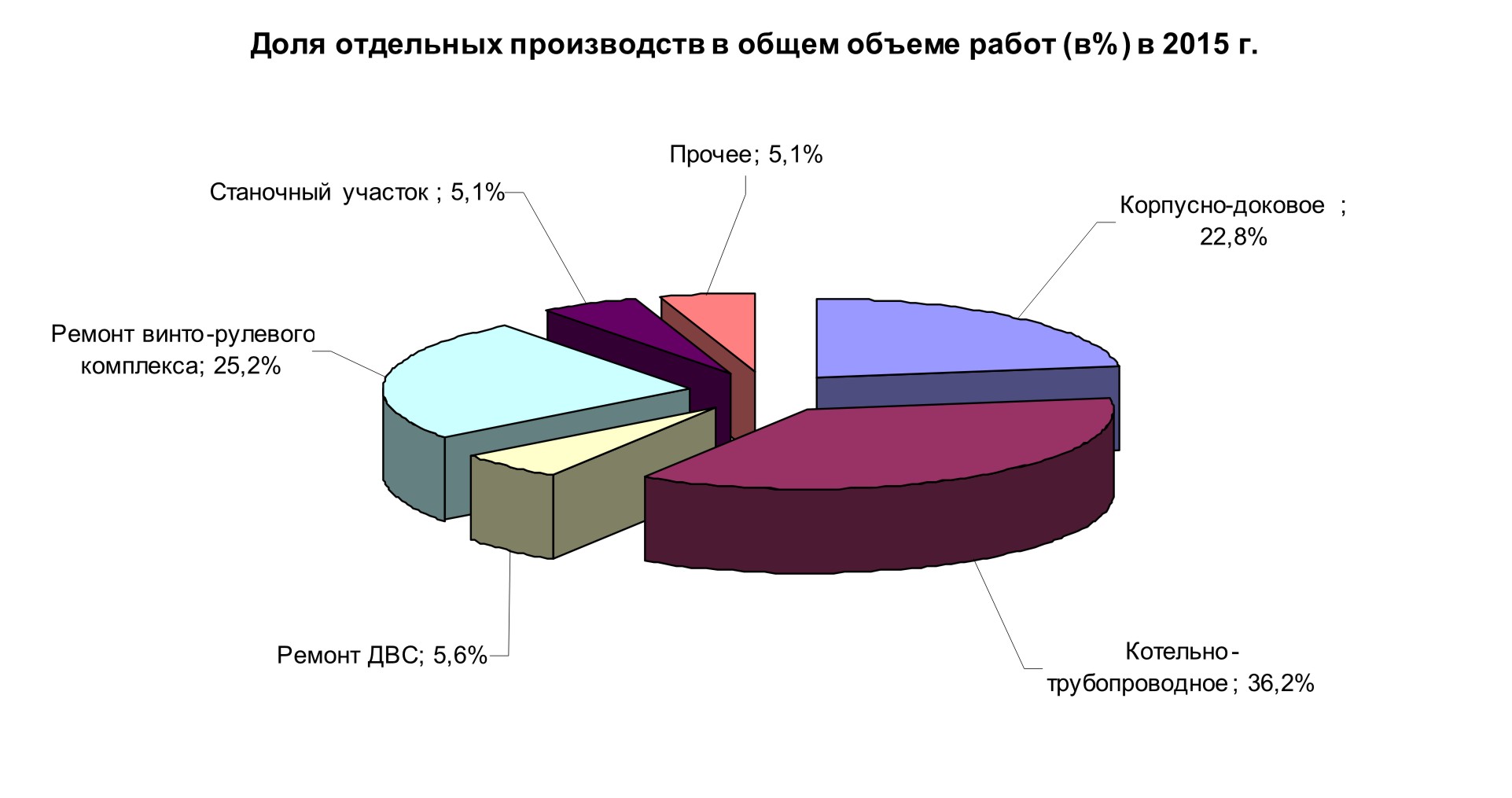 В денежном выражении объем производства повторил результат 2014 года на 100,1%. Наибольший объем работ выполнен специалистами котельно-трубопроводного производства (см.схему) – 36,2%, слесарно-механического производства по ремонту винто-рулевого комплекса (25,2%), а также корпусно-докового производства – 22,8%.