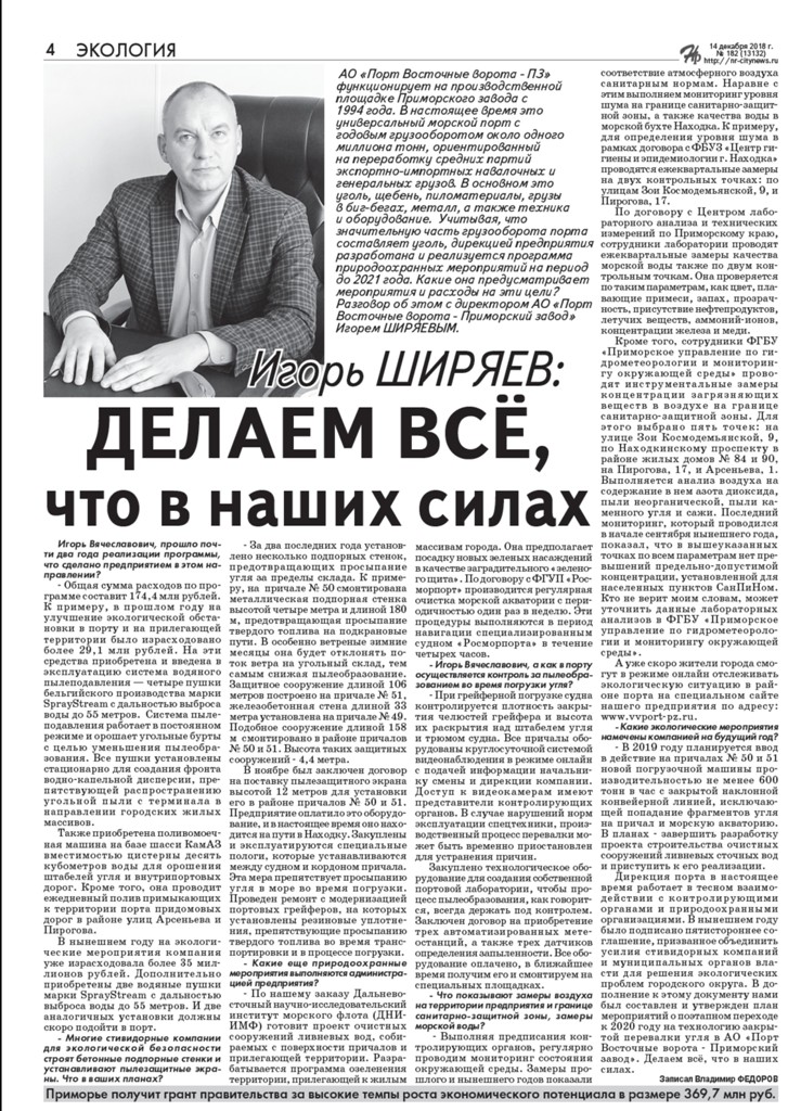14 декабря 2018 года в городской газете "Находкинский рабочий" опубликовано интервью с Директором АО "Порт Восточные ворота-Приморский завод" И.В.Ширяевым, в котором он затрагивает экологические проблемы. Мы публикуем текст интервью.