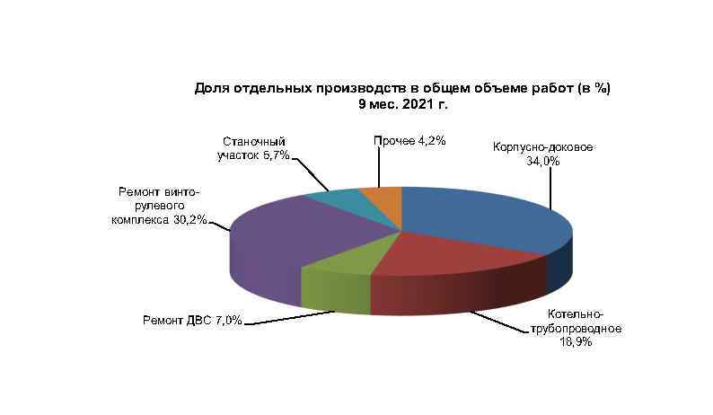 Наибольший объем работ выполнен специалистами корпусно-докового производства – 34 % (см. схему), слесарно-механического производства по ремонту винто-рулевого комплекса (30,2%), котельно-трубопроводного производства – 18,9%.