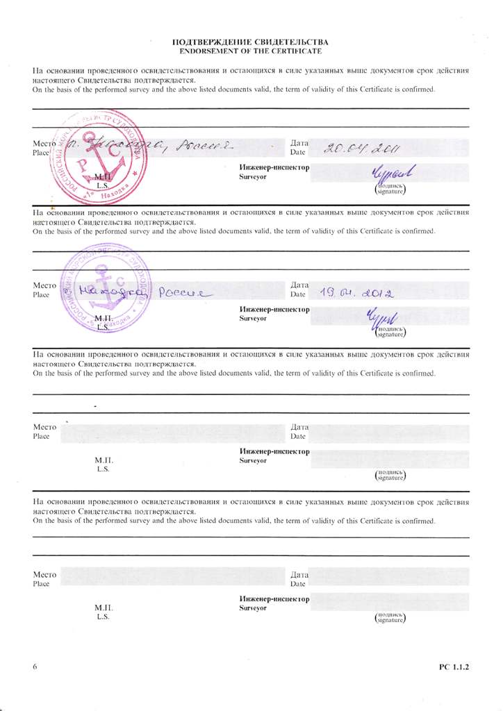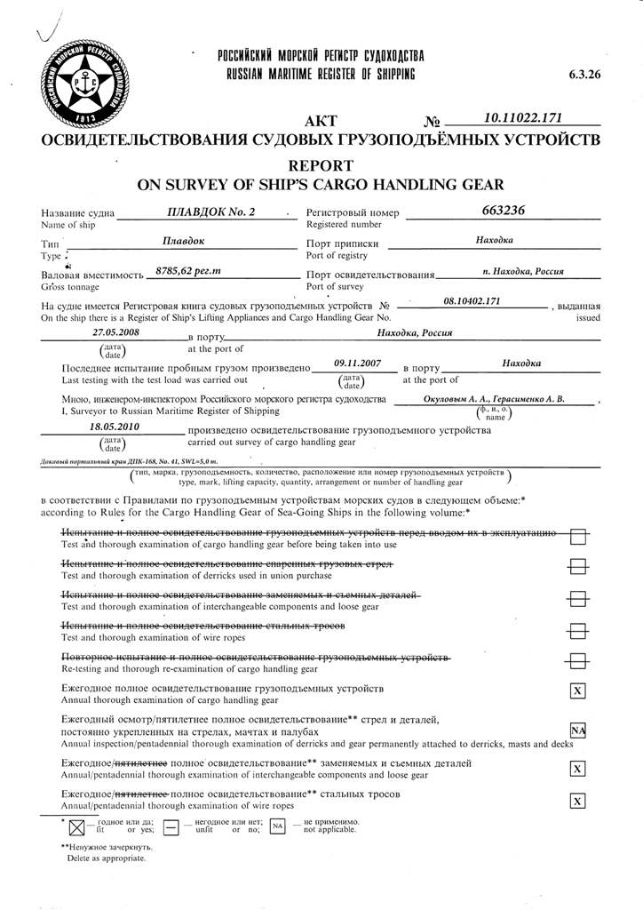 Свидетельство об испытании и полном освидетельствовании докового портального крана ДПК-168, №41 - выдано Российским Морским Регистром судоходства 09.11.2007 г. Действительно до 09.11.2012