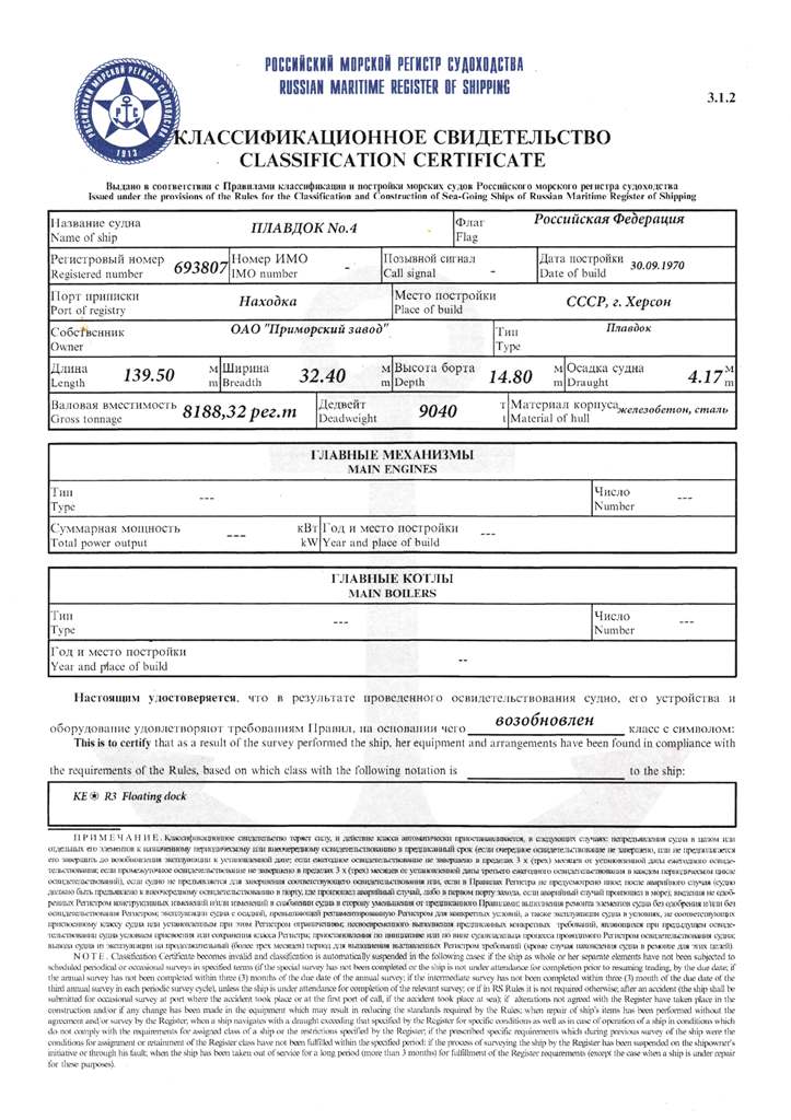 Свидетельство об испытании и полном освидетельствовании докового портального крана ДПК-168, №41 - выдано Российским Морским Регистром судоходства 09.11.2007 г. Действительно до 09.11.2012