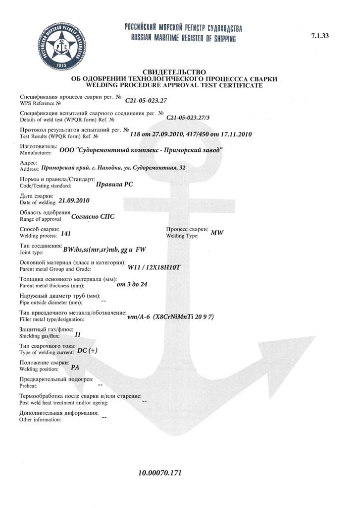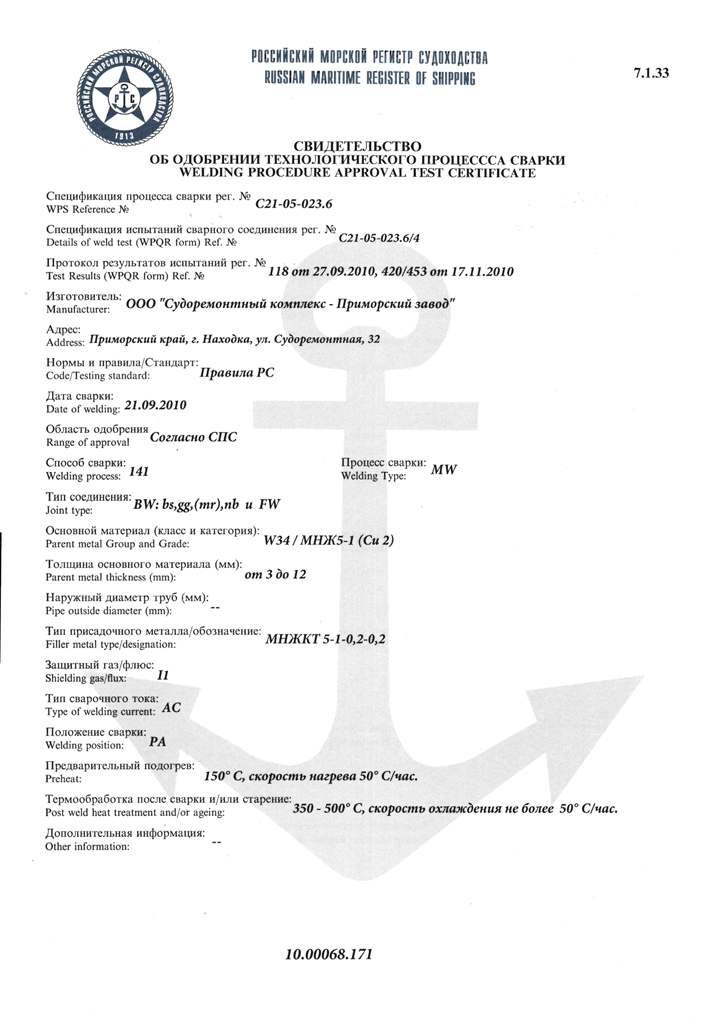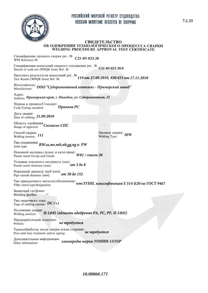 Свидетельство об одобрении технологического процесса сварки рег. № С21-05-023.28. Действительно до 06.12.2012 г.