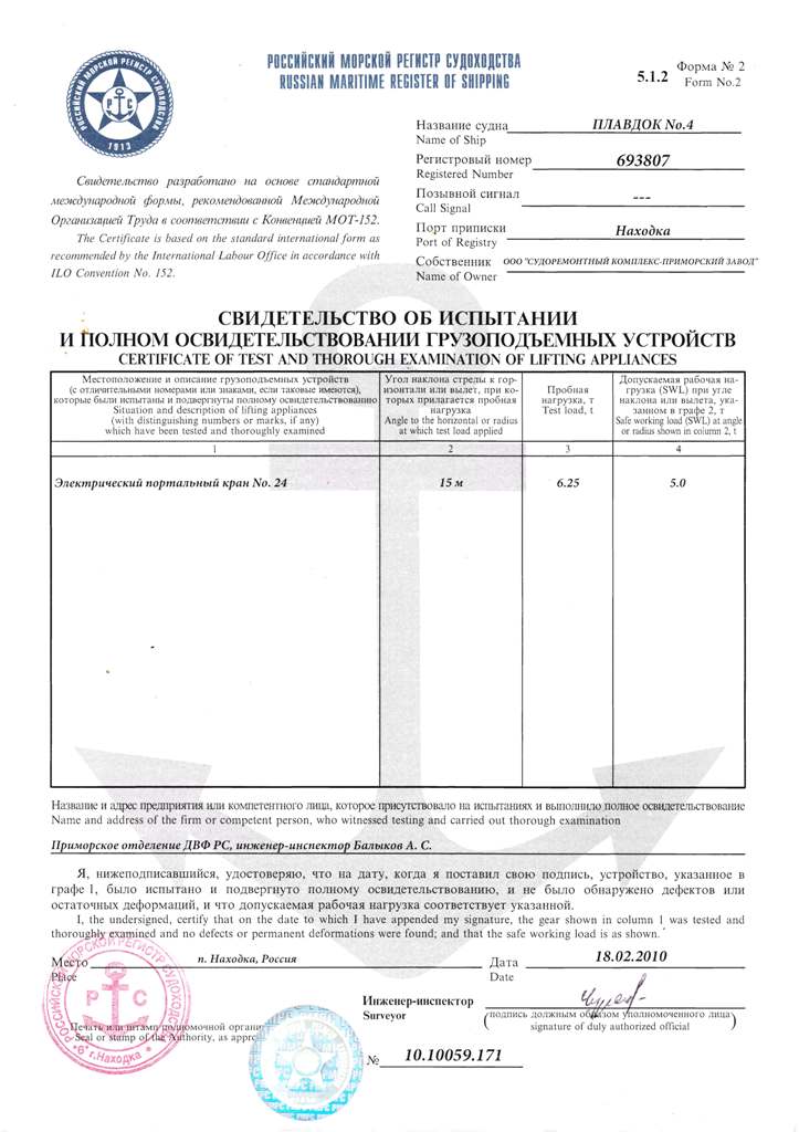 Свидетельство об испытании и полном освидетельствовании электрического портального крана №24. Выдано Российским Морским Регистром судоходства 18.02.2010 г.