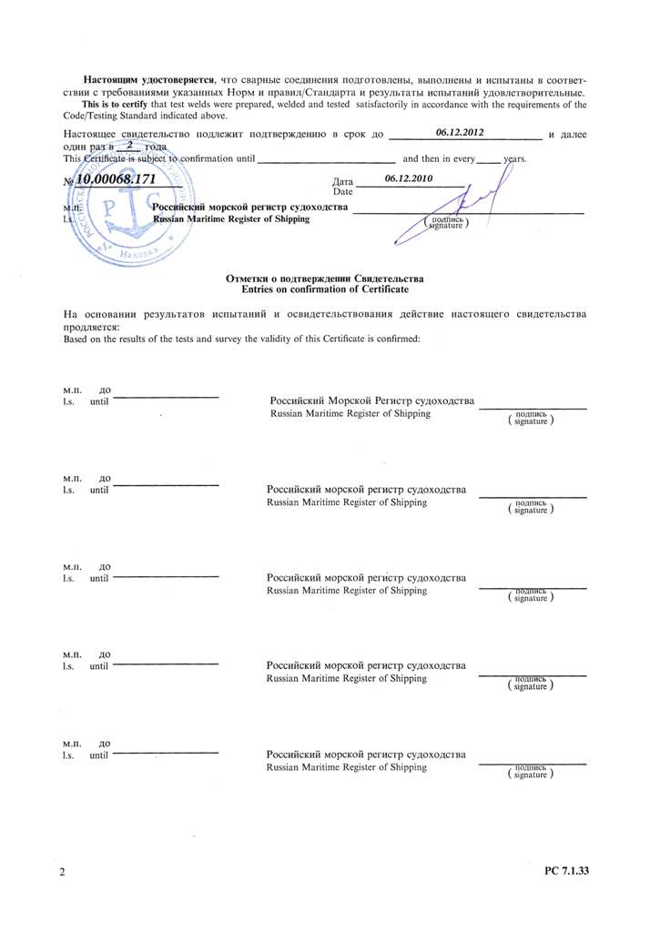 Свидетельство об одобрении технологического процесса сварки рег. № С21-05-023.27. Действительно до 06.12.2012 г.