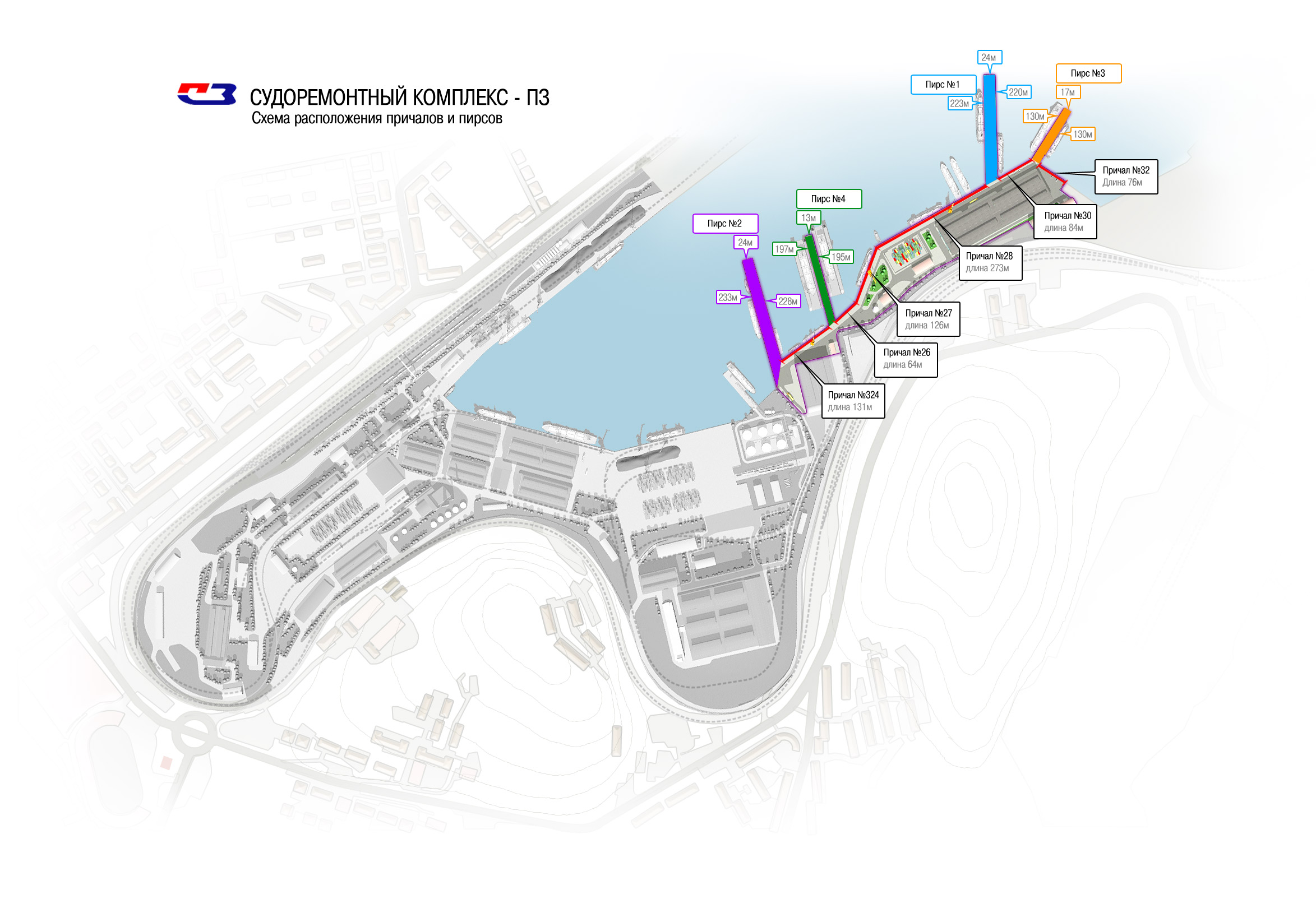 Глубина у кордона причалов и глубоководных пирсов составляет от 10 до 12 м, что позволяет принимать в ремонт суда водоизмещением до 8 500 тонн.