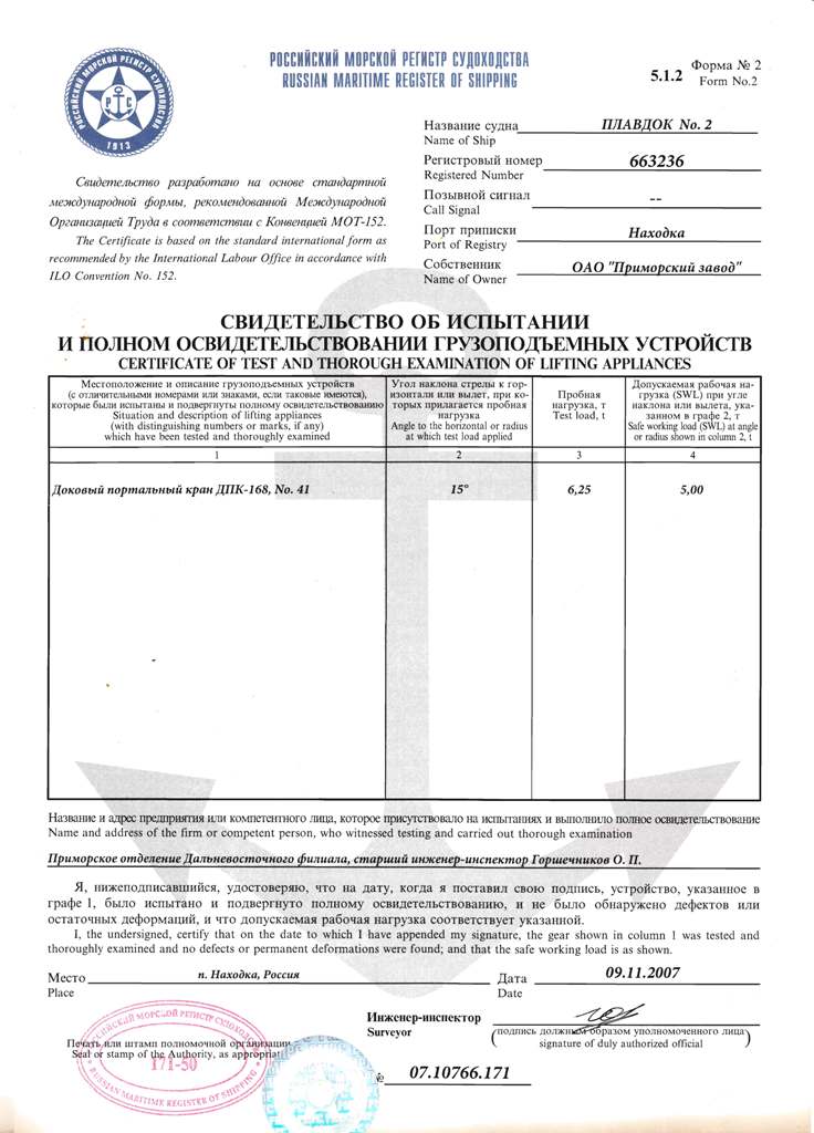 Док,№ Класс РМРС Проект Материал корпуса Грузоподъемность, т Длина, м Ширина, м Высота борта,м Осадка,м Валовая вместимость, рег.т Кол-во и грузоподъёмность кранов, т плавдок №2 K*R3 Floatimg dock 122 А бетон (понтон и башни) 6000 131,8 22 14,6 4,16 8 785,6 2x5 т плавдок №4 K*R3 Floatimg dock 1760 бетон (понтон), сталь (башни)